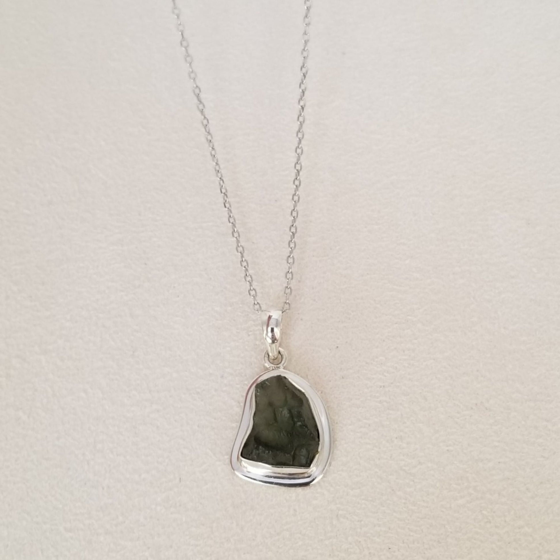 Beautifully crafted sterling silver pendant. Moldavite is a powerful and rare crystal known for its intense energy and transformative properties. Formed from a meteorite impact in the Czech Republic around 15 million years ago, Moldavite is considered one of the most potent stones for spiritual growth and transformation.